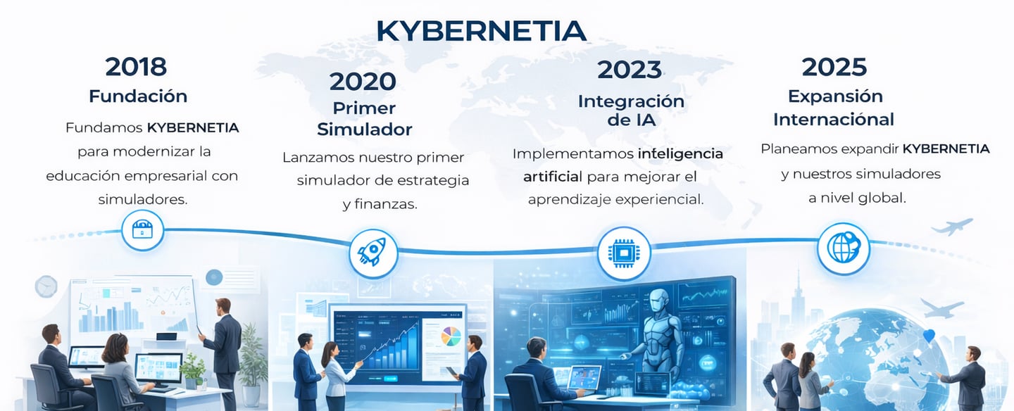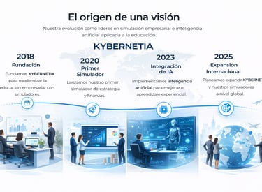 KYBERNETIA nace en 2018 como una iniciativa orientada a transformar la educación empresarial. Desde su origen, integra simuladores, gamificación y tecnología aplicada como herramientas pedagógicas clave para aprender haciendo, alineado con el enfoque STEAM y el desarrollo de competencias estratégicas.